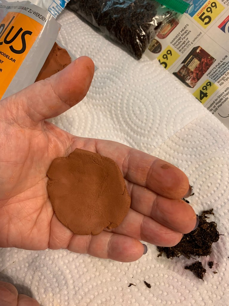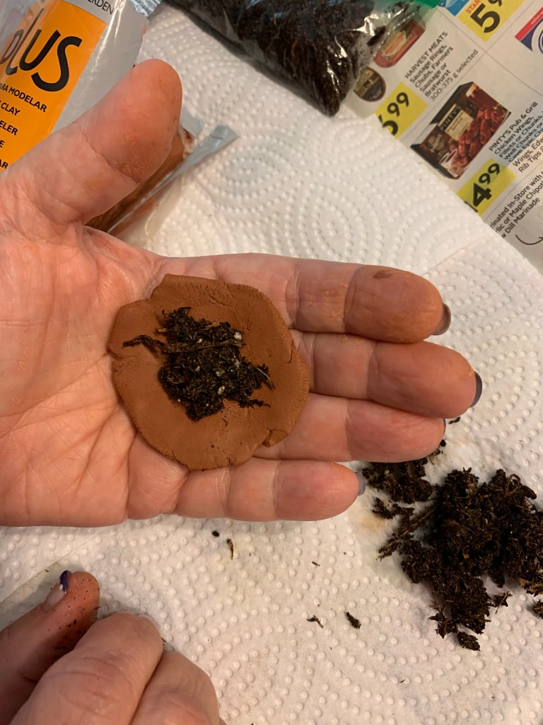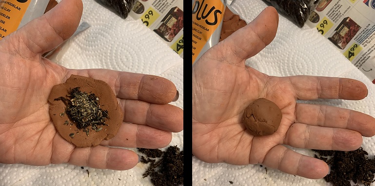Take a ball of clay and knead it until it is soft. Then flatten it into a circle in your palm. Take a pinch of dampened potting soil or compost and put it in the middle of the flattened clay.