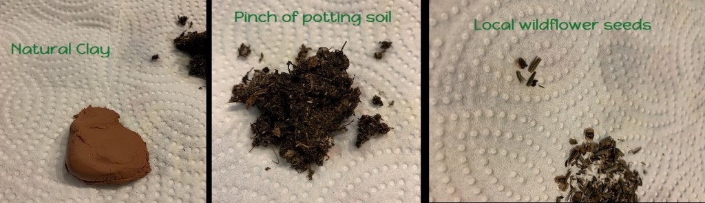 Seed balls are a good way to plant local native plants. Wildflower mixes are good, but check them first to make sure they don’t contain local invasive species. Other good choices are vegetables such as lettuce, spinach, kale, chard, radish, or tomatoes.